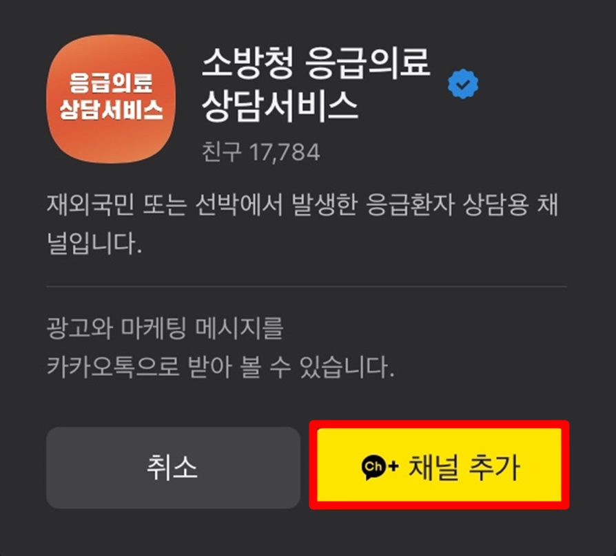 위와 같이 ‘소방청 응급의료 상담서비스’ 카카오톡 채널을 ‘친구 추가’하면 상담받을 수 있는 간단한 방식