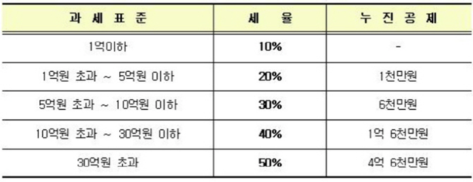 - 30억 원 초과의 경우 50% (누진공제 4억 6,000만 원)입니다.