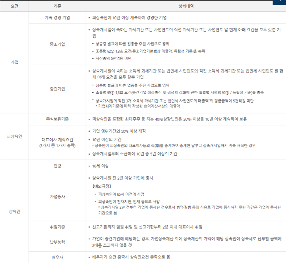 - 아래 요건을 모두 충족할 경우 가업상속 공제가 가능합니다.
