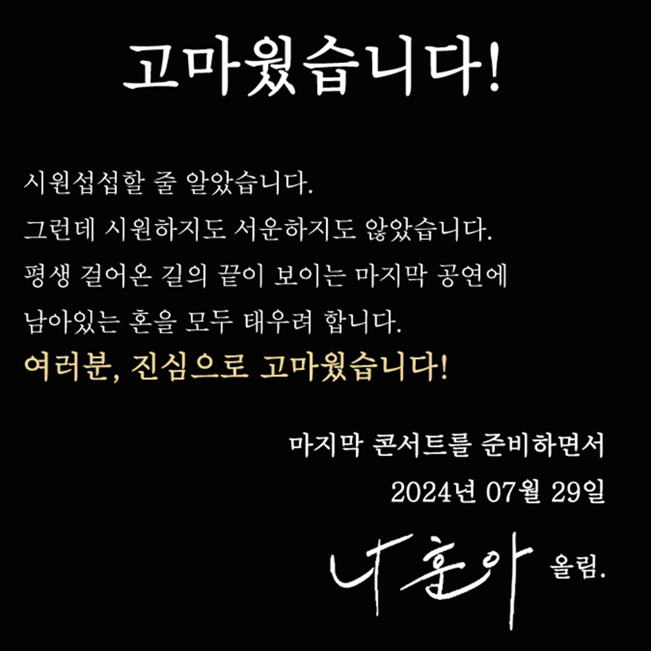 지금까지 나훈아의 마지막 은퇴 공연 안내였습니다. 앞으로는 더 이상 보고 싶어도 라이브 무대를 볼 수 없습니다. 일정 참고 하셔서 티켓 예매 하시고 좋은 추억 남기시길 바랍니다.