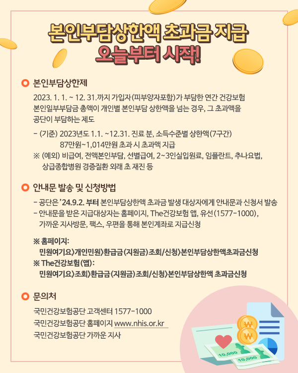 2023년도 개인별 본인부담상한액이 확정됨에 따라 9월 2일부터 상한액 초과금 지급 절차를 시작한다고 밝혔다. 건보공단은 지급 대상자에게 이날부터 본인부담상한액 초과금 지급신청 안내문(신청서 포함)을 순차적으로 발송할 계획이다.