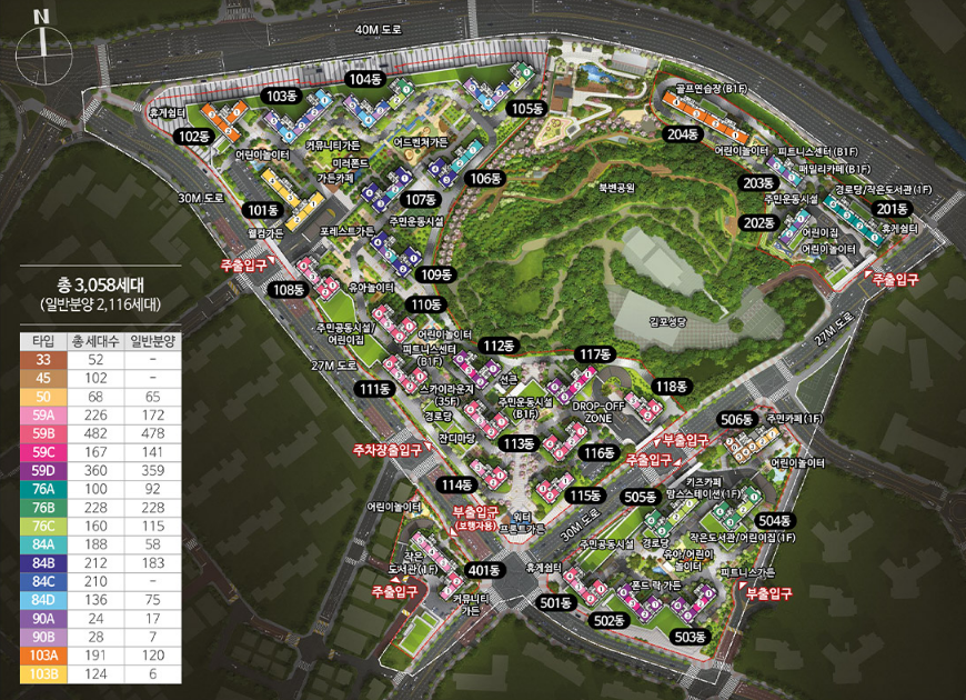일반분양 2,116세대 [특별공급 999세대(기관추천 196세대, 다자녀가구 211세대, 신혼부부 353세대, 노부모부양 63세대, 생애최초 176세대) 포함]이며, 전용면적 50~103㎡로 나뉘어져 있습니다.