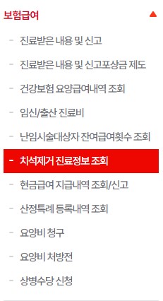 홈페이지를 이용할 경우에는 ‘홈페이지 → 로그인 → 민원 여기요 → 개인민원 → 보험급여 → 치석제거 진료정보 조회’ 순으로 들어가면 스케일링을 받은 시기 및 보험적용대상 여부를 확인할 수 있습니다.
