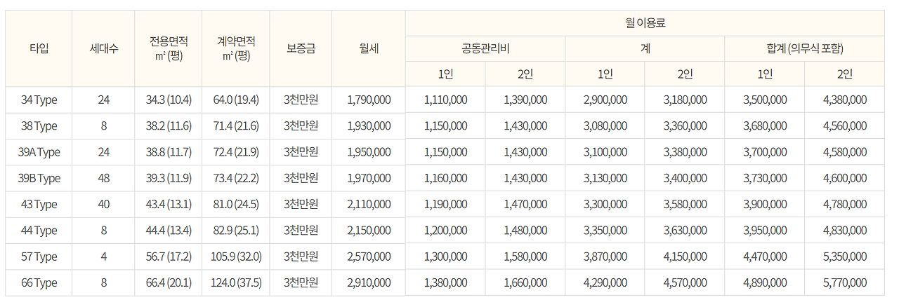 위 월이용료는 보증금 3천만원 때 기준입니다. 보증금이 2억3천만원/3억3천만원 일 경우 이용료로 상단의 홈페이지를 통해 추가로 확인하시기 바랍니다.