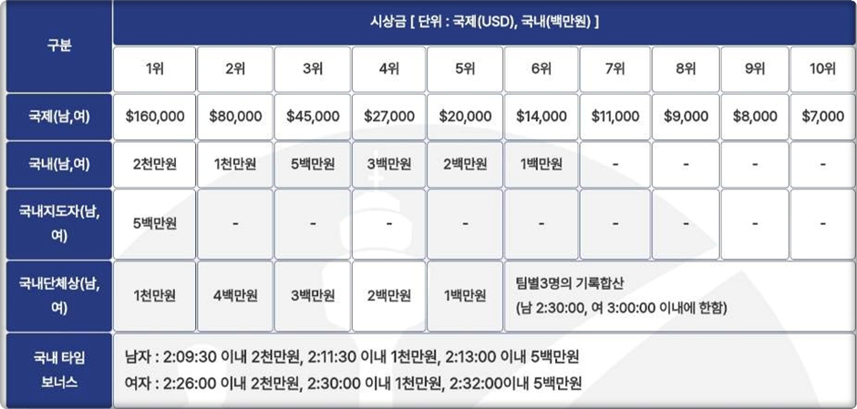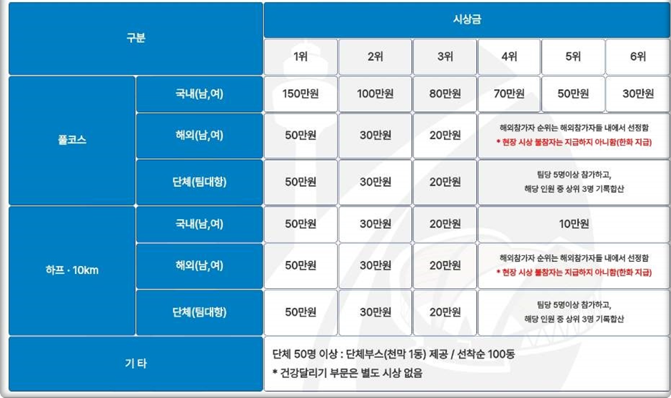 마스터즈 부문의 풀코스 국내 1위는 150만 원, 2위는 100만 원의 상금을 받으며, 해외 참가자는 1위에게 50만 원이 지급됩니다.