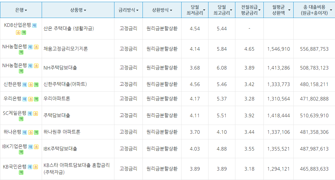 위 대출테이블은 고정금리, 원리금분할상환, 30년 대출 조건으로 검색한 결과 입니다.
