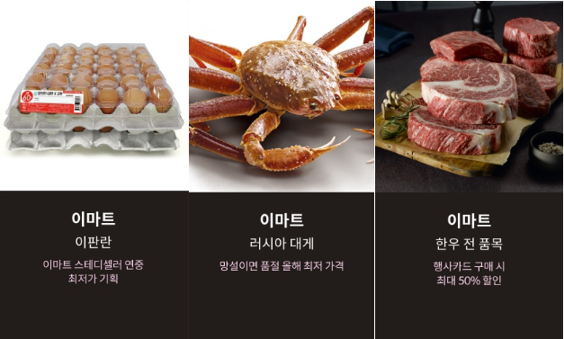 - 한우 전 품목 : 50% 할인(행사 카드 구매시), 1일부터 단 3일만