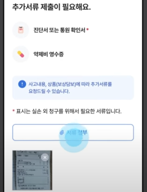 경우에 따라 추가 서류가 필요할 수 있어요. 예를 들어, 통원비 청구 시 진단서 등의 추가 서류가 필요할 수 있습니다. 필요한 서류는 앱에서 사진으로 촬영해 업로드하거나 파일로 첨부할 수 있습니다.
