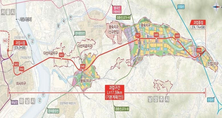현재 공사 중인 9호선 중앙보훈병원역∼강일동 구간(4단계)과 고덕·강일지구, 미사지구, 남양주 왕숙·왕숙2지구, 진접2지구를 차례로 연결한다.