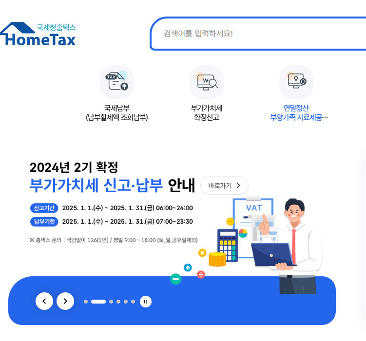 홈택스를 활용하면 신고가 훨씬 쉬워졌지만 1월 31일까지 신고 및 납부 해야 합니다. 부가세 신고를 미루지 말고 지금 바로 상단의 홈택스에 접속 하세요..