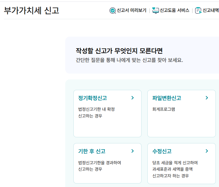 더불어 홈택스에 로그인하면 신고 유형(정기/조기), 과세 유형(일반/간이), 신고 대상 기간이 자동 반영 되어 고민할 필요가 없습니다.
