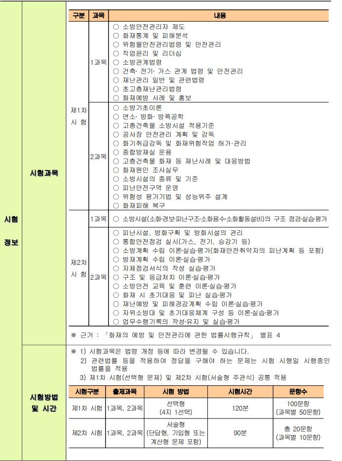2025년 소방안전관리자 자격시험 일정은 아직 확정되지 않았지만, 일반적으로 매년 정기적으로 시행됩니다. 시험 과목은 소방관계법령, 소방학개론, 화기취급감독, 소방시설의 구조 및 점검 등으로 구성되어 있습니다. 각 과목은 이론과 실습으로 나뉘며, 실무 능력을 평가하는 데 중점을 둡니다.