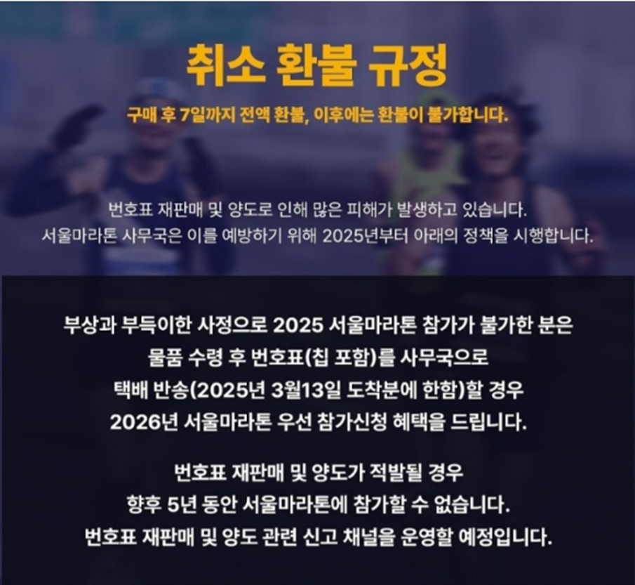 2월 12일(수) 14시 까지 취소 시 전액환불이 가능하며, 또한 부득이한 사정이 생길 경우 3월 13일까지 번호표를 택배 반송할 경우에 2026년 서울마라톤 우선 참가신청을 준다고 하니 이만하면 좋은 조건 같습니다.