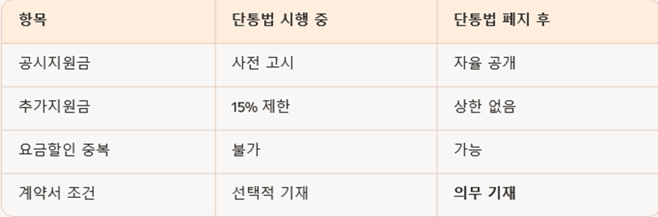 - 공시지원금 + 추가지원금 상한 폐지 → 유통점마다 할인 폭 달라짐