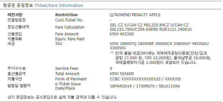 구입한 멜번으로 향하는 티켓의 가격은 아래와 같다.