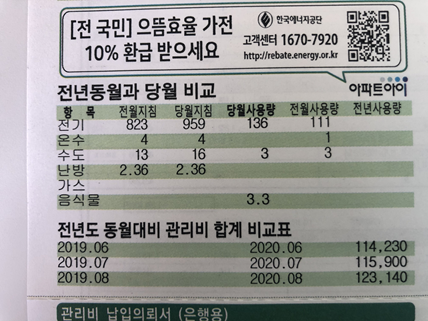 • 저희 아파트의 경우 가스요금과 인터넷요금 빼고는 모든 비용이 관리비에 포함되어 있습니다.