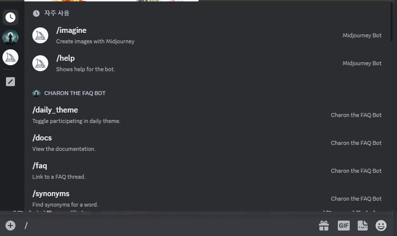 가장 기본적인 명령어, /imagine... 엑셀처럼 + 버튼을 누르면 자주 사용하는 명령어가 쫙 뜬다. 위의 이미지에는 표시가 안되었지만 /imagin 옆에 prompt라고 뜨는데 그 옆에다 명령어를 입력하면 된다. 처음에 명령어를 어디에 입력하는 줄 몰라서 당황한 기억이 난다.