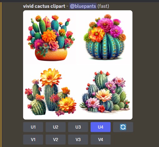 Imagin 명령을 하면, 바로는 안되고 좀 시간이 걸린 후에 위와 같은 이미지를 생성해 준다. 여기서 U는 upscale를 의미하고 V는 variance를 의미한다. 숫자는 z 순서대로 1, 2, 3, 4 이다.