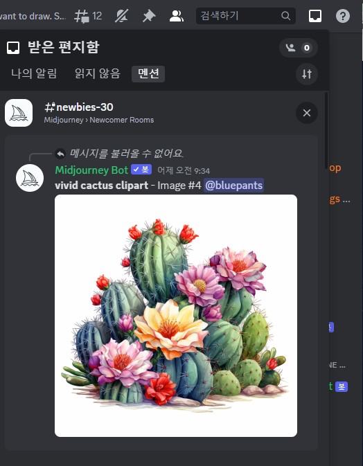 위의 메신저(?) 창에는 나 말고도 다른 사람들의 글?멘션?이 많아서 내 요청 이미지를 찾기가 힘들다. 이럴경우 위의 이미지 오른쪽 물음표 옆... 지하철? 모양 아이콘을 누르면 받은 편지함으로 이동한다. 여기서 내가 요청한 작업들을 확인 할 수 있다. 위의 이미지는 내가 명령한 이미지인데 딱 마음에 들지는 않는다. 더 화려한 명령어와 묘사를 할 줄 몰라서...