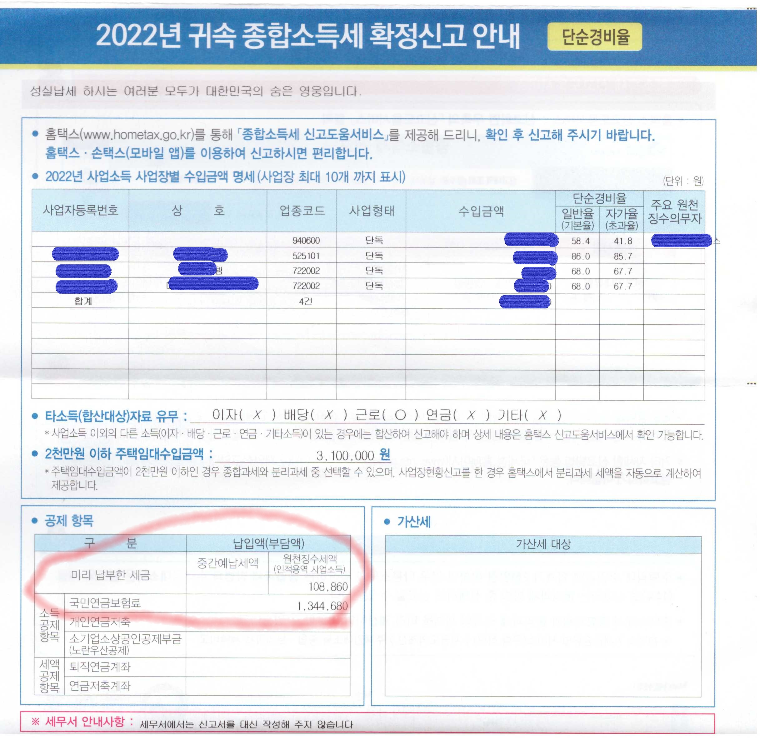 저도 종합소득세 확정신고안내문을 다시 보다가 어.. 이 금액 뭐지... 라고 해서 국민연금보험료와 소득누락된 금액을 발견해서 다시 작성 후 신고 했습니다. 환급액이 좀 줄어든 것 같기는 한데 더 정확하게 작성했죠.