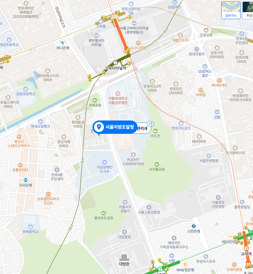 또는 2호선 서초역에서 내리면 됩니다. 서초역에서 걸어가는 것보다는 버스를 이용하는 것이