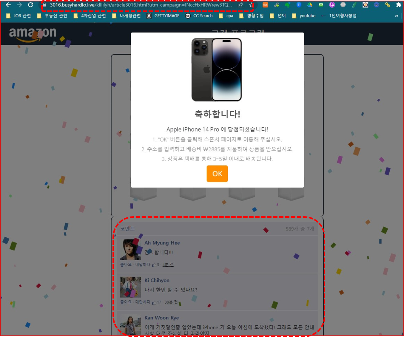 아마존에서 뭘 검색하고 있는데, 갑자기 새로운 화면이 뜨더니 신형 아이폰 14 pro 준다는 말에