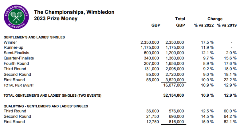 3. 2023 윔블던 테니스 대회 총상금 및 우승상금