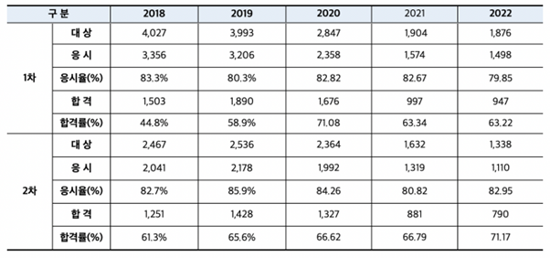 아래의 표를 보면 생각과 다르게 합격률이 나오는데, 1차 합격률이 2차 보다 더 낮습니다. 이는 1차