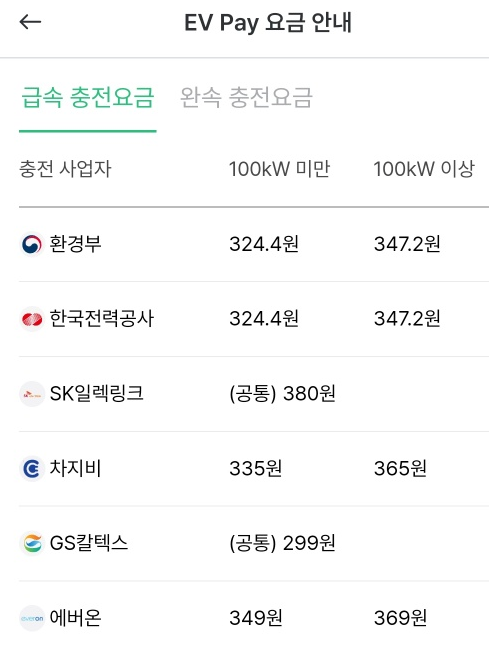 급속 충전요금이 완속 충전요금보다는 비쌉니다. 실제 충전 하는 걸 지켜보니 충전 사업자마다 결재 방식도