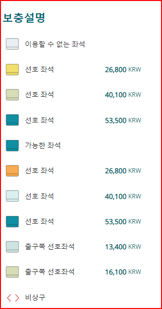 그러나 원하는 좌석을 마음대로 고를 수 있는 건 아니고 아래와 같이 추가 요금이 필요한 좌석이 구분되어 있었습니다.