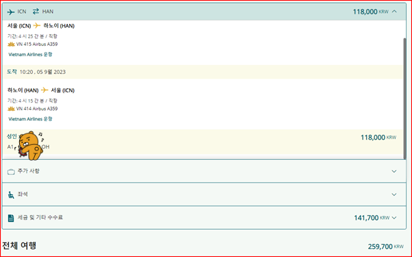 5. 2023년 8월 인천-하노이 베트남항공 결재금액