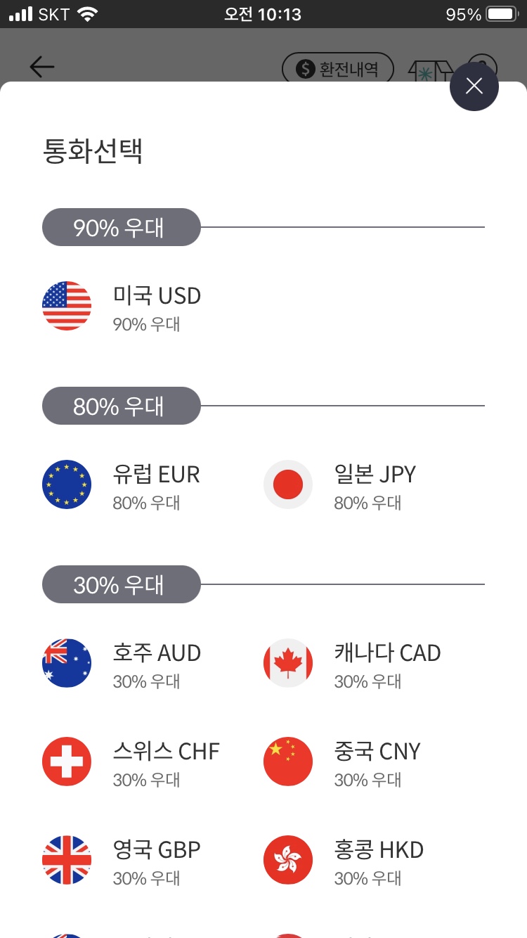 주요 통화 중 달러는 90% 환율 우대를 받으나 기타 통화는 30% 환율 우대 밖에 안됩니다. 더불어 태국 바트화는 기타 통화에 포함되나 베트남 동은 포함이 되지 않습니다.