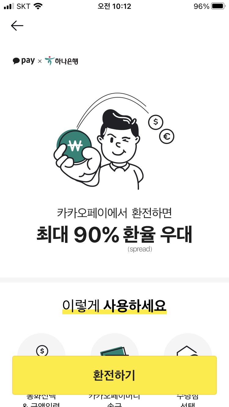 정확히 말하면 카카오뱅크가 아니라 카카오페이에서 신청하는 겁니다. 그런데 카카오뱅크에서도 카카오페이에서도 환전 항목이 눈에 띄지 않습니다. 하지만 걱정하지 마세요. 쉽게 알려드리겠습니다.
