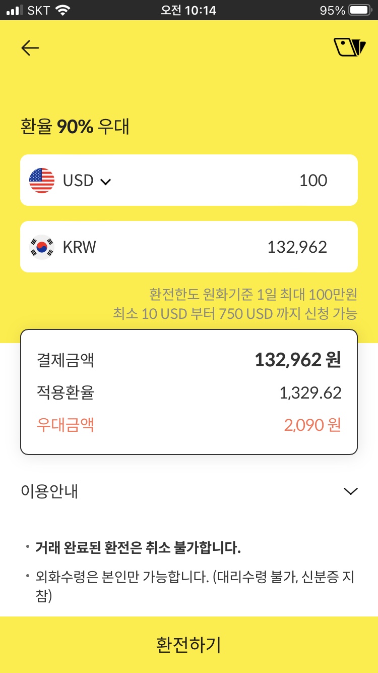 똑같이 달러 90% 환율 우대를 받는데 100달러를 환전 시 결제금액이 다르다.