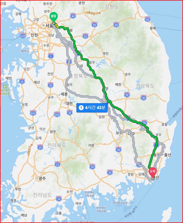 경기도 삼송 – 경기도 남양주시(다산신도시) – 청도새마을 휴게소 – 광안리역