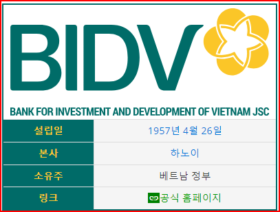 이제야 알게 된 사실인데 BIDV(BANK FOR INVESTMENT AND DEVELOPMENT OF VIETNAM JSC)는 베트남 국영 상업은행 중 총자산 기준으로 1위 은행이라고 합니다. 허접한 은행이 아니었습니다.