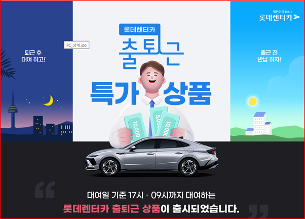 최근에 무더운 여름날 제 친구가 김포공항에서 소카를 예약했는데 사전공지 없이 차량 위치가 이동되어 무거운 짐을 들고 1km 넘게 이동했다는 얘기를 들었습니다. 가격은 조금 더 비싸지만 고객만족이 확실한 각 렌터카 회사의 이벤트를 알려드리겠습니다. 오늘은 첫번째로 롯데렌터카 이벤트 입니다.