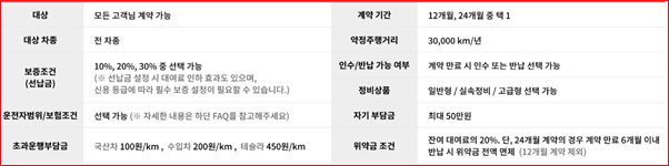 계약기간은 12/24개월 중 선택가능하며, 약정주행거리는 30,000 km/년, 계약종료 후 인수/반납 선택이 가능합니다.