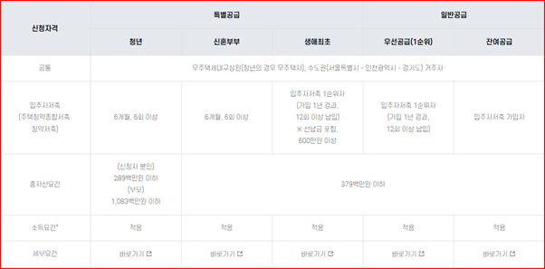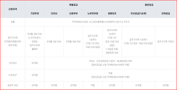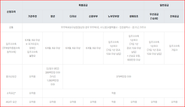 - 신청자, 배우자, 신청자 또는 배우자의 세대별 주민등록등본에 등재된 신청자의 직계존속 및 직계비속 등이 전원 무주택이어야함 (분양권등 포함) (단, 청년특별공급의 경우 신청자 본인이 무주택자)