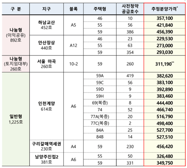 가장 중요한 가격은 아래와 같습니다. 나눔형과 일반형 추정분양가는 전용면적 60㎡ 이하의 경우 2~4억원대, 전용면적 69~84㎡ 의 경우 4~5억원대 수준으로 예상됩니다. 추정분양가에 대한 자세한 내용은 아래 국토교통부 보도자료를 확인해보시기 바랍니다.