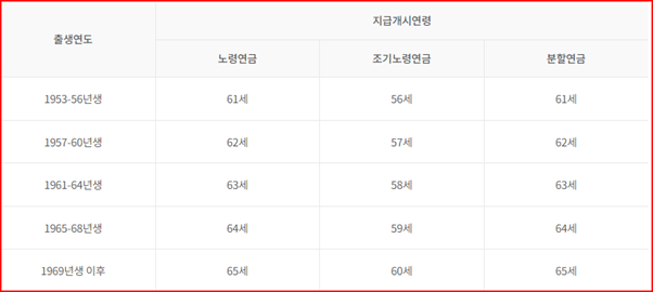 출생 연도에 따라 수령 시기가 달라집니다. 1969년 이후 출생자는 65세가 되서야 연금을 받을 수 있습니다. 그러나 노후연금을 일찍 받고자 하는 경우 조기수령이 가능하지만 수령액이 감소합니다. 따라서 신중한 선택을 하셔야 합니다.