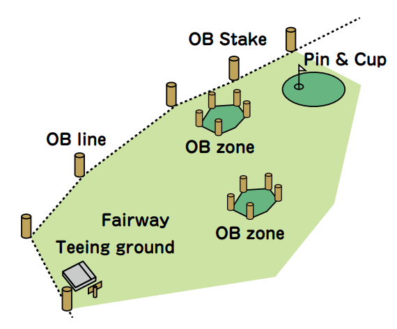각 홀은 티잉 그라운드에서 컵까지의 길이가 20~100m이며, 파3, 파4, 파5가 될 수 있습니다. 하프 라운드는 9홀, 총 파 33개, 1라운드는 18홀, 총 파 66개입니다.