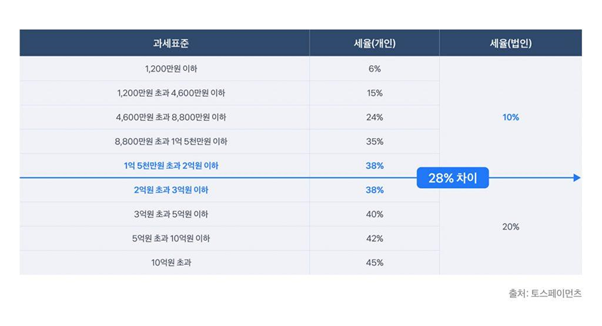 예를 들어, 개인사업자와 법인사업자가 동일하게 과세표준액(종합소득액에서 소득공제액을 제외한 금액)이 2억원 일 경우 개인사업자는 78백만 원,반면에 법인사업자는 20백만 원의 세금을 납부해야 합니다. 단순 소득세율만 고려 시 56백만 원의 세금 차이가 납니다.