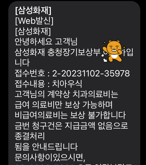보험금 청구한 다음 날 오후 보상 담당자로부터 문자를 받았습니다. 위의 내용처럼 해당 사유가 아니라서 지급을 거절 한다는 말이었습니다. 분명히 가능하다고 했는데, 내가 잘 못 이해를 한 것인가? 하도 궁금해서 보험사에 연락을 했습니다. "레진 치료는 원래 보상이 불가능 한거냐" 라고 물으니, 담당자 왈 문자 안내가 잘 못 나갔다고 합니다.