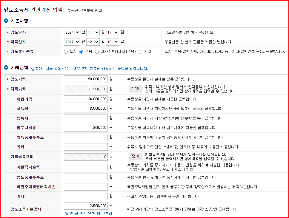 - 필요경비 : 양도와 관련하여 발생한 비용입니다.