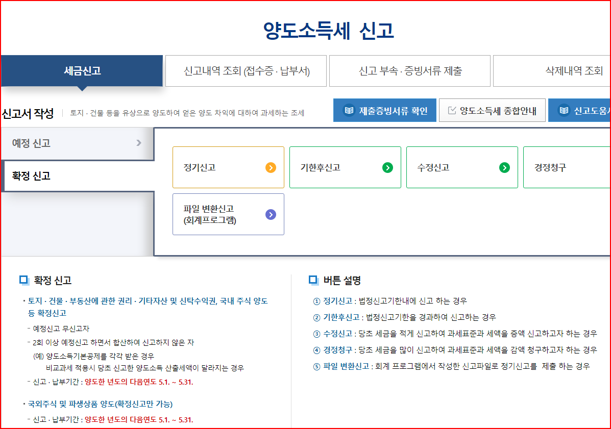 양도소득세는 양도한 날로부터 3개월 이내에 신고·납부해야 합니다. 양도소득세 신고도 국세청 홈택스에서 온라인으로 신고 할 수 있습니다.