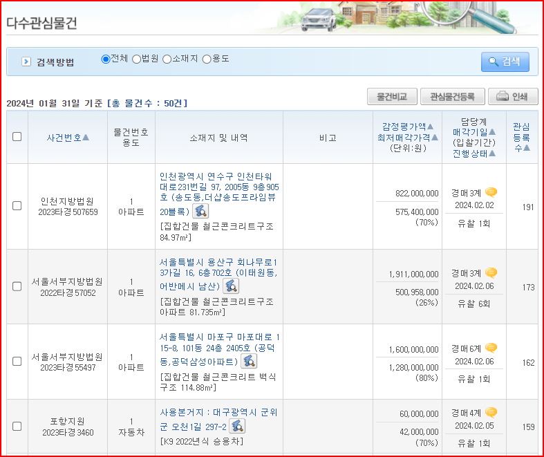 - 전체/법원/소재지/용도에 따라 다수조회물건 및 다수관심물건을 직접 검색 가능