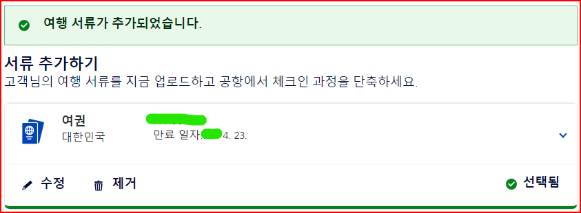 4) 드디어 에어프랑스 사이트에 여권정보 등록을 마쳤습니다.