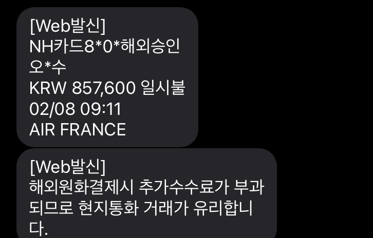 우리나라의 경우 카드번호 기재하고, 인증 절차를 거쳐야만 결재가 되는데, 그것도 에러가 나서 인내심을 필요로 하는데 Air France에서는 준비도 하기 전에 카드 결재 문자가 날라왔습니다.