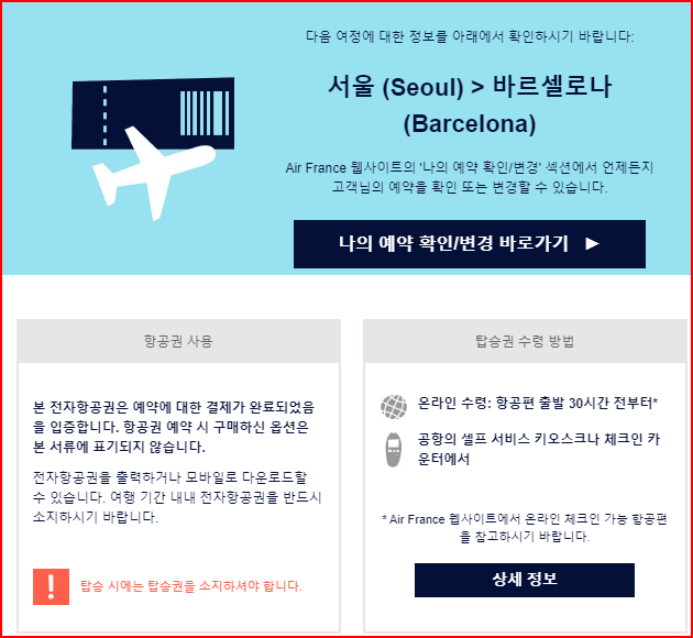 1) 항공료 결재 후 날라온 이메일에서 나의 예약 확인 바로 가기를 누릅니다.